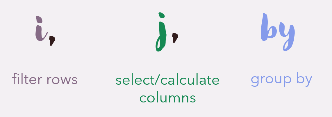 The main syntax that data table uses is the DT[i, j, by]