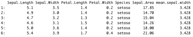 data[, Sepal.Area := Sepal.Length * Sepal.Width]