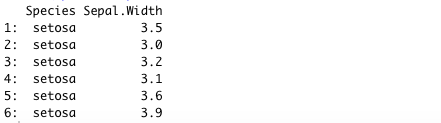 Let say you want to filter your dataset to contain all rows, but only the Species and Sepal Width columns. Note that you will leave the i section empty by just adding a comma before the j section.